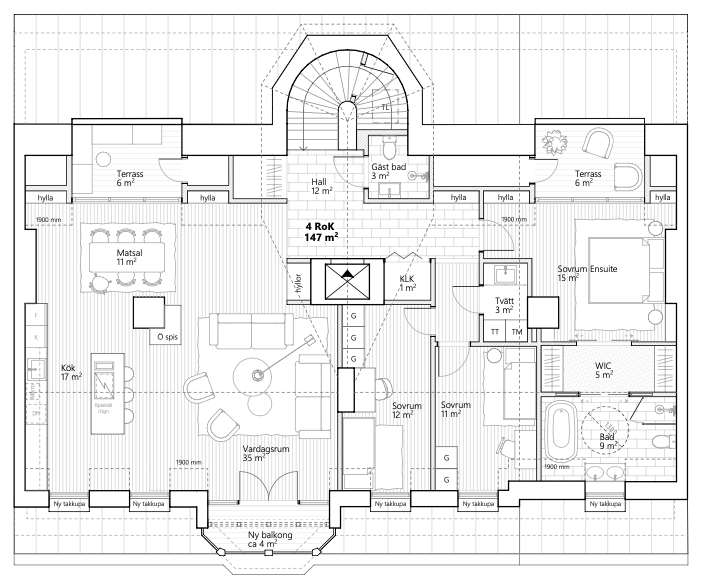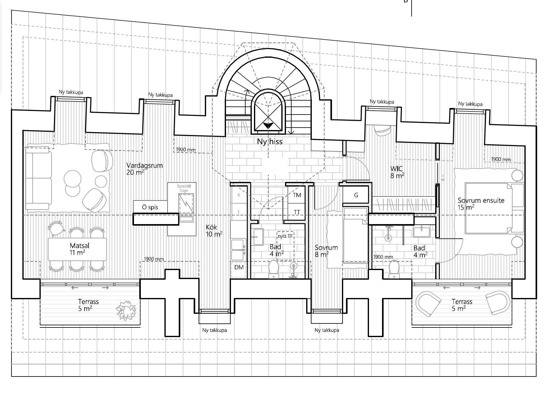 Planritning av lägenhet i gårdshuset. Design och layout projekteras efter fastighetens utformning i samarbete med våra arkitekter på Atelje Nord. Hiss direkt in i lägeheten.